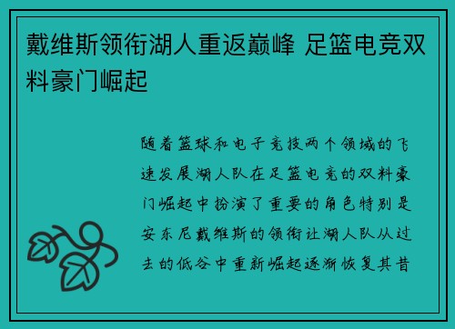 随着篮球和电子竞技两个领域的飞速发展,湖人队在足篮电竞的双料豪门崛起中扮演了重要的角色。特别是安东尼·戴维斯的领衔,让湖人队从过去的低谷中重新崛起,逐渐恢复其昔日的辉煌。文章将从多个角度分析湖人队如何...