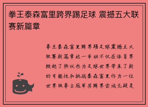 拳王泰森·富里跨界踢足球,震撼五大联赛新篇章。这一举动不仅在体育界掀起了热议,也为足球世界带来了新的可能性和挑战。泰森·富里作为一位世界级拳击冠军,其跨界尝试无疑是一场体育领域的大震动。他的体能、球场...