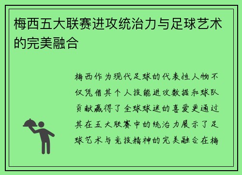 梅西作为现代足球的代表性人物,不仅凭借其个人技能、进攻数据和球队贡献赢得了全球球迷的喜爱,更通过其在五大联赛中的统治力,展示了足球艺术与竞技精神的完美融合。在梅西的职业生涯中,他无论是在西甲的巴萨,还...