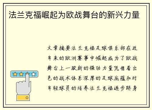 文章摘要: 法兰克福足球俱乐部在近年来的欧洲赛事中崛起,成为了欧战舞台上一股新的强劲力量。凭借着出色的战术体系、深厚的足球底蕴和对年轻球员的培养,法兰克福逐步跻身欧战强队行列。从夺取欧联杯冠军到在欧洲...