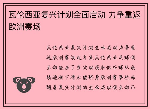 瓦伦西亚复兴计划全面启动,力争重返欧洲赛场。近年来,瓦伦西亚足球俱乐部经历了多次动荡和低谷,球队成绩逐渐下滑,未能跻身欧洲赛事。然而,随着复兴计划的全面启动,俱乐部已经确立了明确的目标,那就是力争重返...